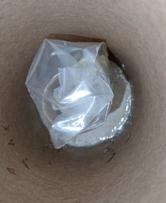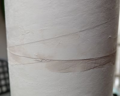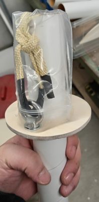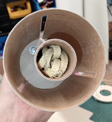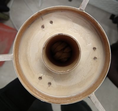 Nachdem sich das Epoxy unten gesammelt hatte, konte ich es -durch Bewegen der Rakete- an den zu klebenden Kanten entlangfließen lassen. Das hat recht gut funktioniert, wenn es auch ein wenig viel Epoxy war...