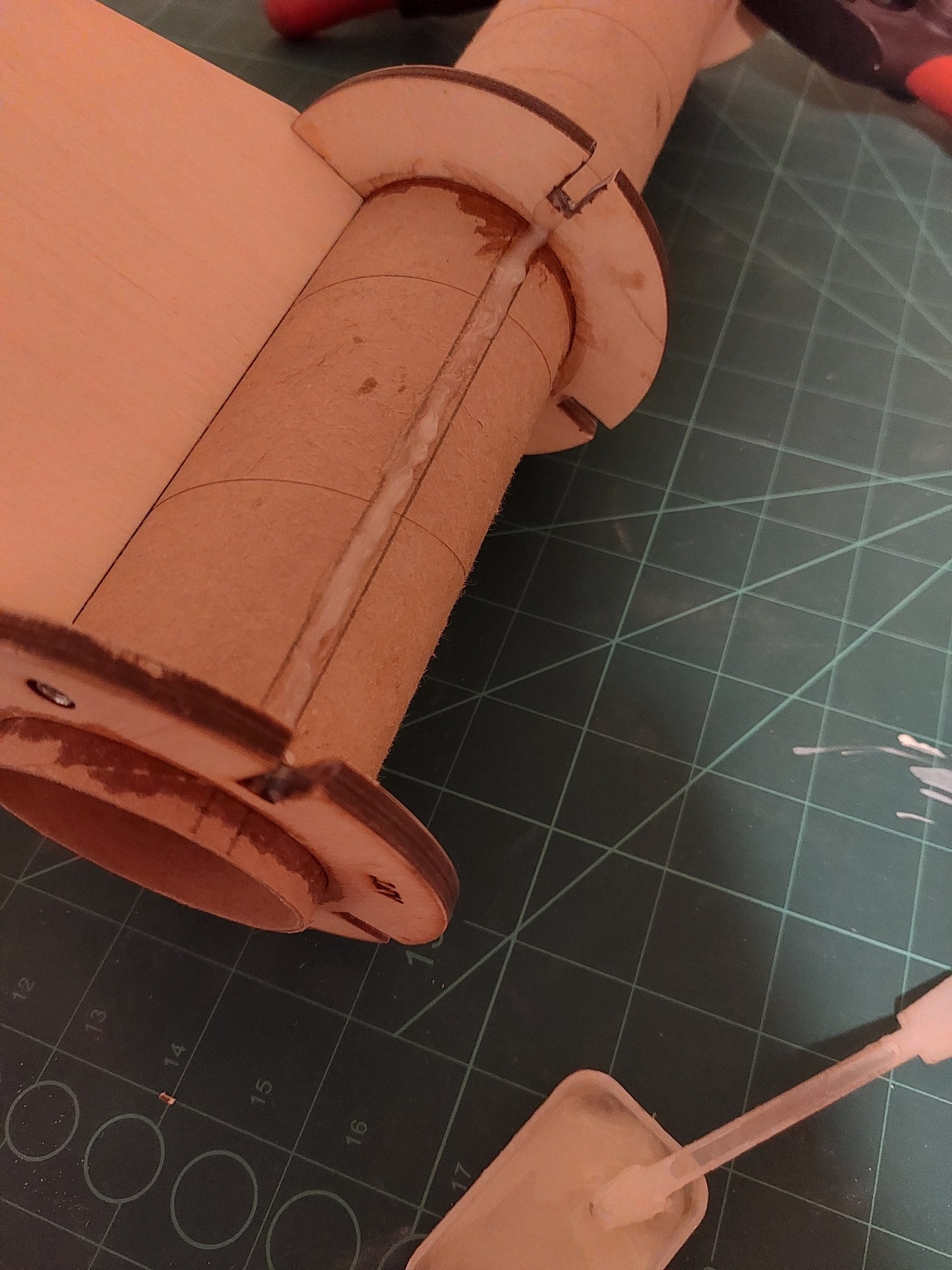 Am Wochenende ging es los. Ich werde zuerst die Flossen samt Spanten und Motorrohr verkleben und dann als eine Einheit in das Körperrohr montieren. Soll laut LOC stabiler sein. Also zuerst alle Teile schleifen und zur Probe zusammengesteckt. Die Passform ist sehr gut. Dann das Motorrohr von der oberen verglasten Schicht befreien. Am Ende einer Spirale kann dazu mit einem Skalpell leicht der Anfang angehoben werden, dann einfach der Spirale folgend abziehen. Die Einschlagmuttern eingepresst und verklebt. Dann den vorderen und mittleren Spant aufs Motorrohr gelebt. Als Kleber nehme ich UHU Plus Endfest