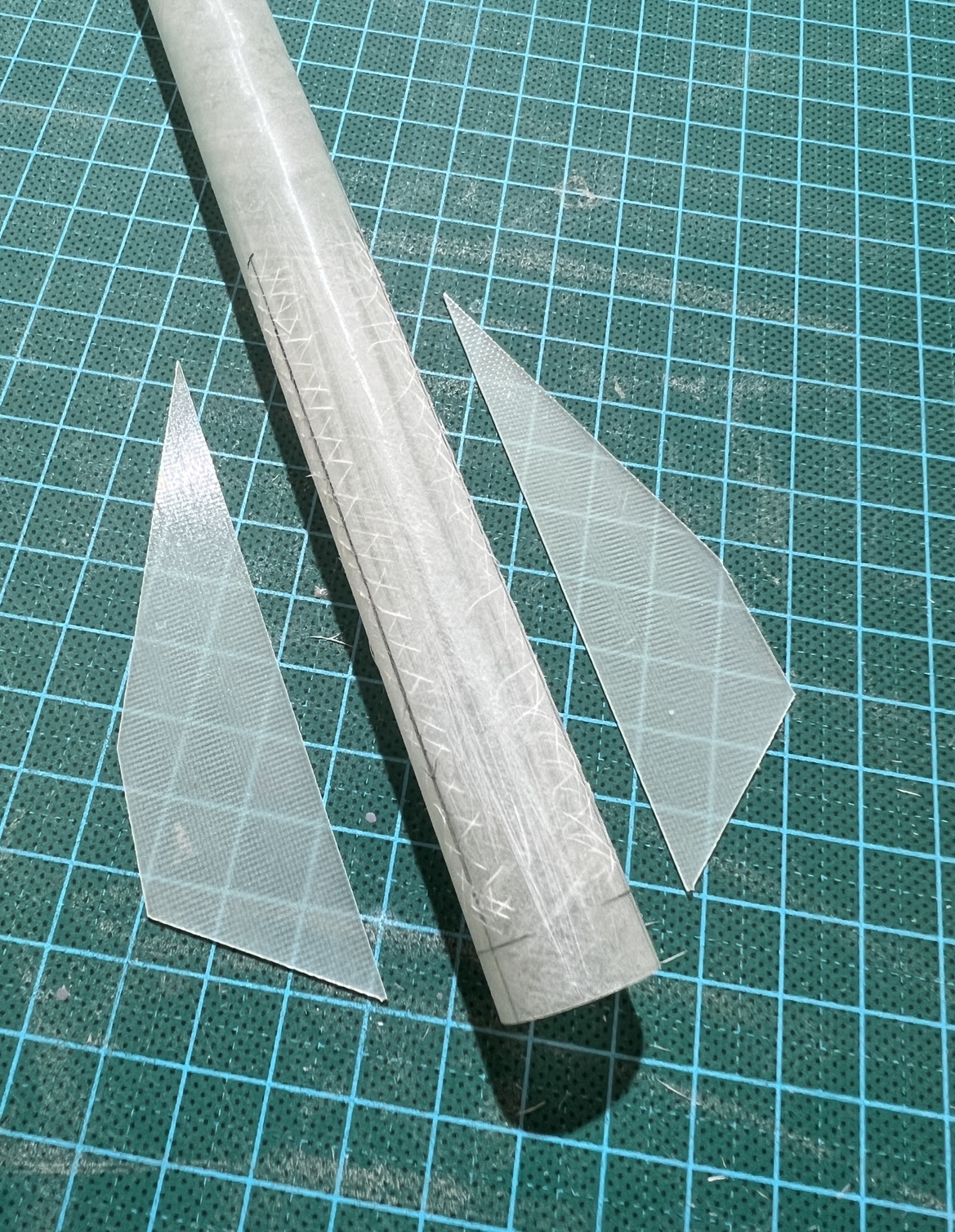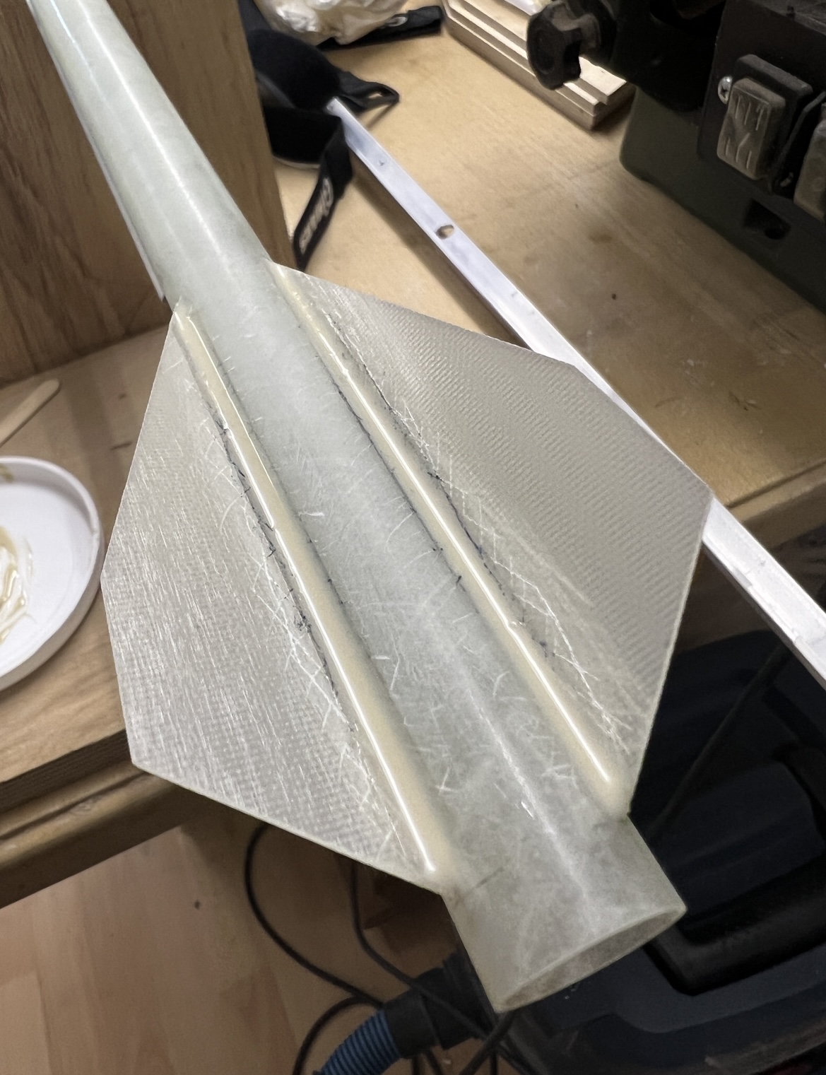 Und wieder ein wenig weiter … Das zweite set Finnen … Alle Finnen sind angeheftet … Ich hatte die Körperrohr Schlitze jeweils an einer Stelle mit dem Proxxon etwas geöffnet . Hier habe ich jetzt mit einer Spritze in jede “Kammer” ein definiertes Volumen Harz gegeben. 1ml in die großen vorne und 0,5ml in die kleinen hinten … alles mit Klebeband abgedichtet und dann sehr lange in alle Richtungen gedreht … das Harz hat sich so entlang aller innen Stosskanten gesetzt und quasi mini fillets ausgebildet .. im unteren Bild kann man gut sehen wie alles benetzt ist .. Bei der kleinen habe ich schonmal mit den außen Fillets angefangen … Heute also später geht es dann weiter . Grüße Marco