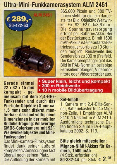 Funkkamera ! Was haltet Ihr denn davon bei ebay: SUPER *SPIONAGE *FUNK* KAMERA*NEU*400 meter Artikelnummer 3010676404 VG Rainer |