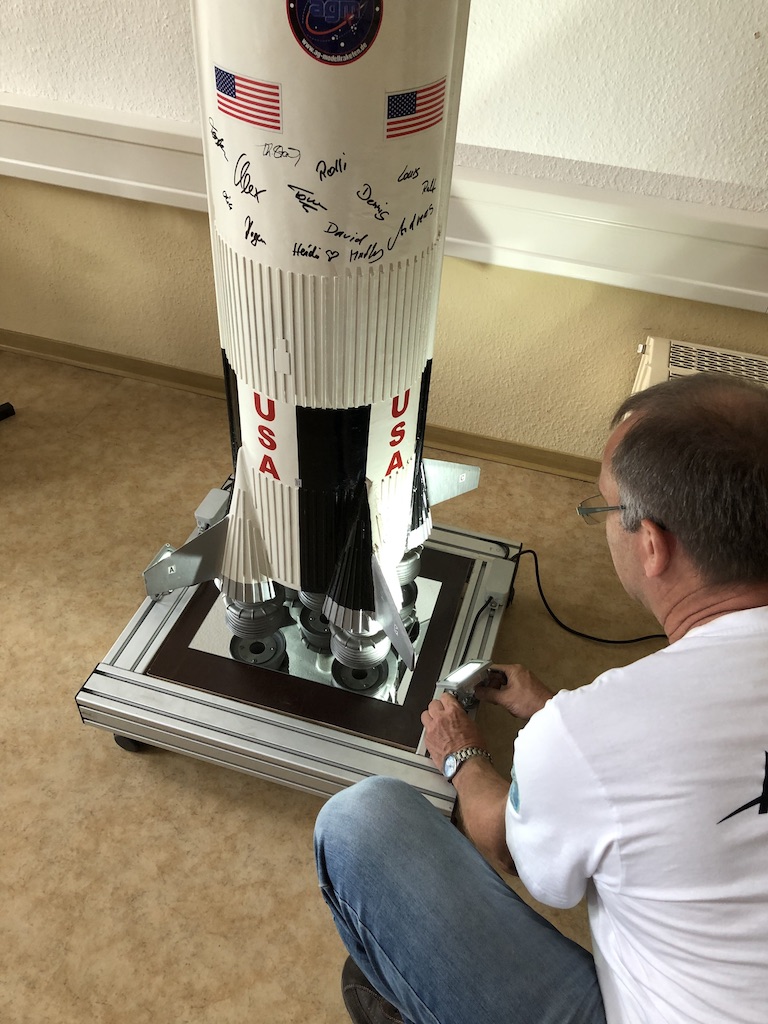 Heute haben Andreas und ich meine Rockets nach Eilenburg in das „Juri Gagarin“-Planetarium gebracht und dort ausgestellt. Die Rockets bleiben dort als Dauerleihgabe von mir Zwecks Präsentation. Ziel der Ausstellung ist es, dem Publikum der Sternwarte Eilenburg technische Objekte der der bemannten und unbemannten Raumfahrt vorzustellen. Der Explorer und die 180ger Saturn V waren ja schon da. Die Restlichen Rockets werden noch auf einem Extraboard aufgestellt und mit entsprechenden Datenblättern versehen. Im sogenannten Konferenzraum fanden dann die Proton und die SaturnV(2019) ihre Endposition. Andreas hat da ganze Arbeit geleistet und die Saturn V mit Spiegel und Halogenstrahler in das richtige Licht gesetzt. So kann man auch von unten die Düsen und das Heck ohne sich bücken zu müssen, betrachten Ich bin jedenfalls glücklich meine Rockets an einem solch passenden Ort ausstellen zu dürfen. Das Transport und Ausstellerteam hat prima funktioniert und die logistischen Hürden, gerade in diesen komplizierten Zeiten, gut gemeistert. Ich möchte an dieser Stelle auch noch einmal Jack von der ehemaligen MORA danken, welcher viele Jahre gut auf meine Modelle aufgepasst hat. Rolli