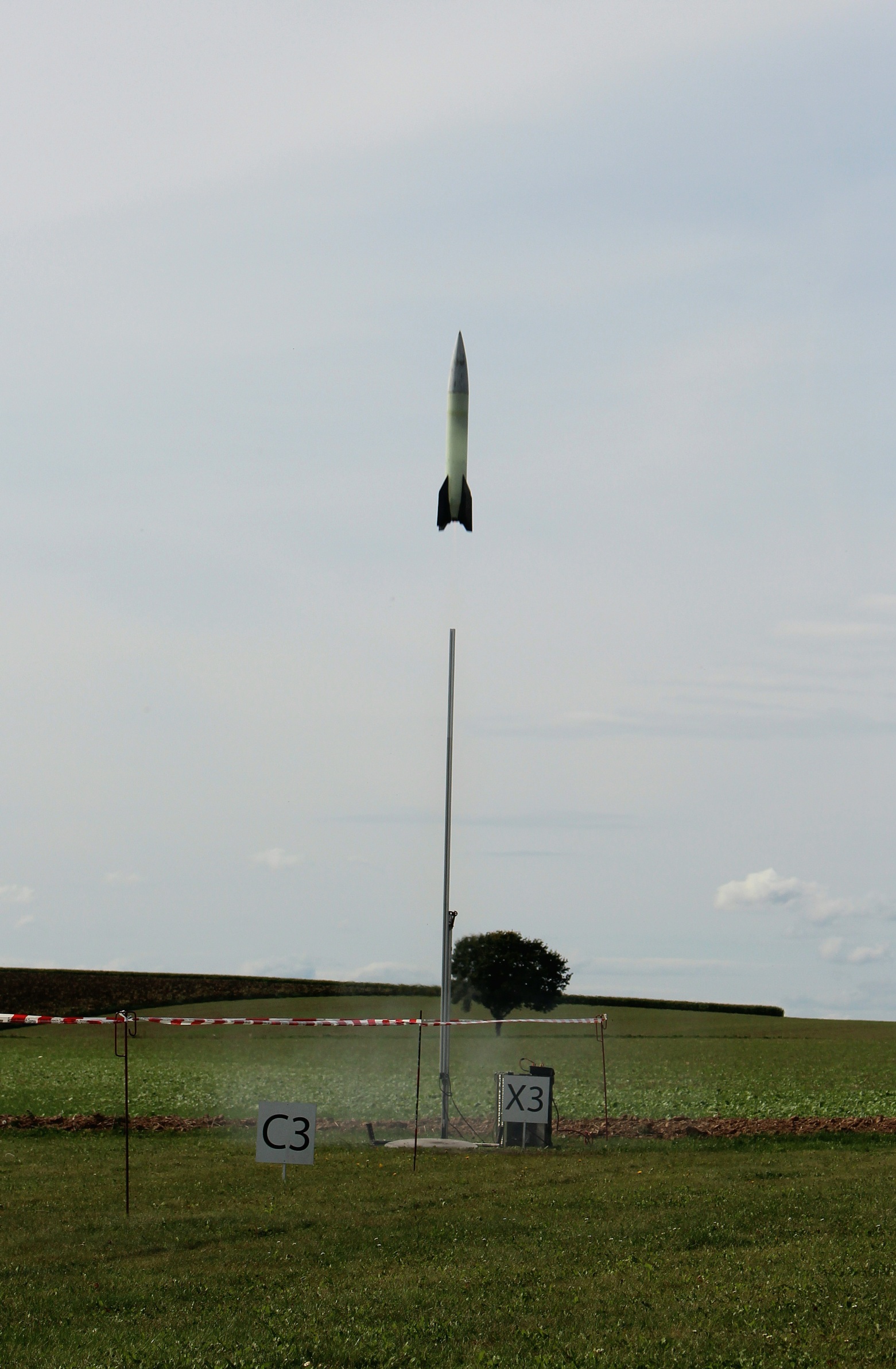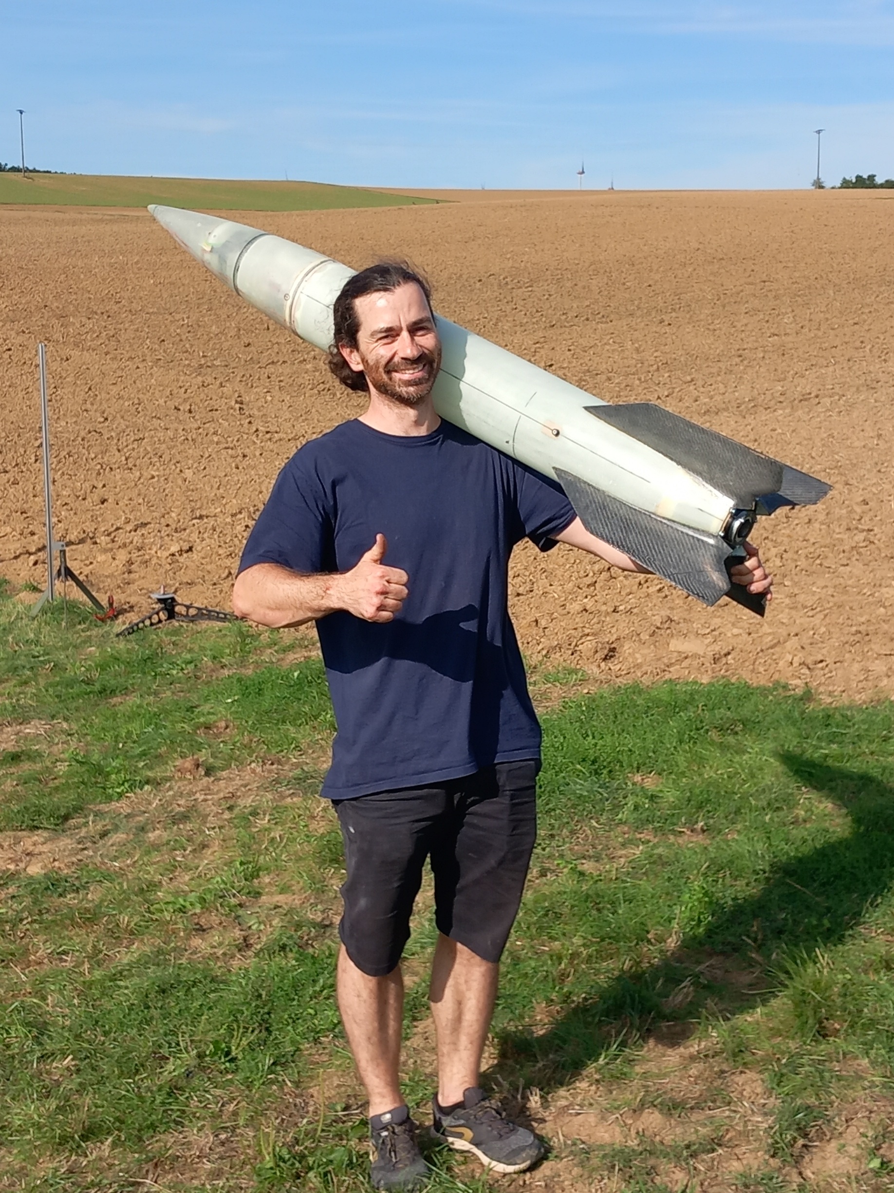 Der Erstflug fand am 6.09. beim RMV Experimental- und Scale-Wettbewerb statt und erreichte mit ~650Ns knapp 370m Flughöhe. Eigentlich hätte es über 400m gehen sollen, aber der Vorschirm würde zu früh ausgeworfen, dazu später mehr. Hier ein paar Screenshots aus den Videos die ich bekommen habe: Und frisch geborgen Keine Woche später gab es dann die nächste Gelegenheit für Flüge beim Solaris-Flugtag in Straubing. Zunächst mit der gleichen Motorisierung, diesmal mit Auswurf am Gipfelpunkt und nicht davor (407m): Der Vorschirm hatte sich in seinem Schutztuch verwurstelt (ja das ist ein Wort) und wollte nicht aufgehen. Bei serieller Zweistufenbergung nicht ganz ideal, aber der Hauptschirm kam trotzdem wie geplant, da in der Rakete genug Platz ist und alles lose gepackt werden kann. Nach zwei Flügen nahe am Original (Flüssig-Flüssig-Antrieb) folgte noch einer auf Hybrid (mehr dazu hier! ). Knapp 800Ns beförderten sie auf 550m: Nächster Halt: Lackierung... 'Technisch gesehen hat alles funktioniert!' -Ich (oft kopiert) |