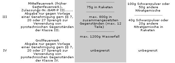 Zitat: Schon richtig, Tom! Nur wie weit geht der T2 Bereich? Die BAM hat da einfach gesagt: ok, Klasse 3 Feuerwerk gibts eh nicht mehr...macht auch wenig Sinn, denn wer den Schein hat, gibt sich mit sowas nicht ab - der schiesst nämlich gleich Klasse IV. Also, da steht auch was mit Raketen drinn und Gewichtsbegrenzung - prima! Das nehmen wir. Bis 75g sind wir T2 alles darüber - Cluster oder nicht - ist Explosivstoff. Punkt. Kannst gerne mal bei der BAM anfragen. Ich kann dir da Nummern und Namen geben. ![]() Hierzu auch mal paar Bildchen: Erstmal Klasse III und Klasse IV: und hier T1 und T2: Interessant ist nämlich, dass es bei T2 in der Tat keine Mengenbegrenzung gibt! Diese Grenze gilt nur für NICHT-ZUGELASSENE Motoren! Das heißt also, um wieder ontopic zu werden und unseren kleinen Exkurs zu beenden: Ich darf mit D12-5 Motoren einen 1000er Cluster fliegen oder einen 7er BC125, wenn ich will - aber ich darf keinen 3er Cluster AT-G40 fliegen. Und genau diese Motoren müssten dann auch eingetragen werden. Also BC125 Reload - nicht unbedingt, aber an einem Flugtag einen G40 mit Ausnahme fliegen: EINTRAGEN, bitte! cheers Oli4 P.S. Man beachte die max. Satzmenge bei T1-Knallkörpern: Egal, wie dick das Dingen an Silvester ist - in deutschen Böllern sind nur 10g drinnen!