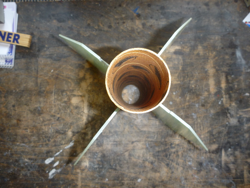 Die letzte Flosse kann auf das Motorrohr geklebt werden: Soweit das Heck. Jetzt steht an die Verbindung der Flossen zum Motorrohr weiter zu verstärken und Feilen/Scheifen bis alles schön passt... Viele Grüße Dennis