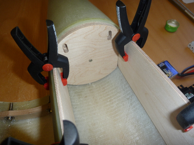Zwischen Motorrohr und Leitwerk sind Fillets eingebracht, und zur Verstärkung mit 160g Glas laminiert. Endlich gehts mal wieder weiter! Im Augenblick grüble ich über Möglichkeiten einen Klappenmechnismus zu realisieren. Ausserdem möchte ich die noch notwendigen Komponenten (Hauptfallschirmkammer, Elektronik ect.) möglichst weit oben unterbringen. Desto geringer wird das zusätzlich nötige Ausgleichgewicht in der Spitze.