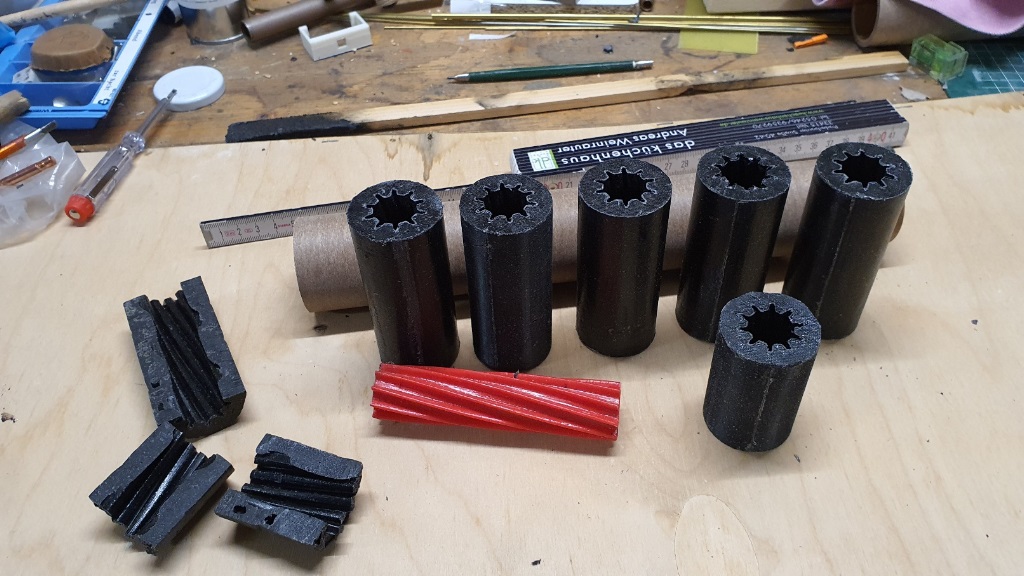Hier die Grains des Motors, bestehend nur aus Epoxy (Klebstoff) und Paraffin (Kerzenwachs)vor dem einkleben in den Liner...