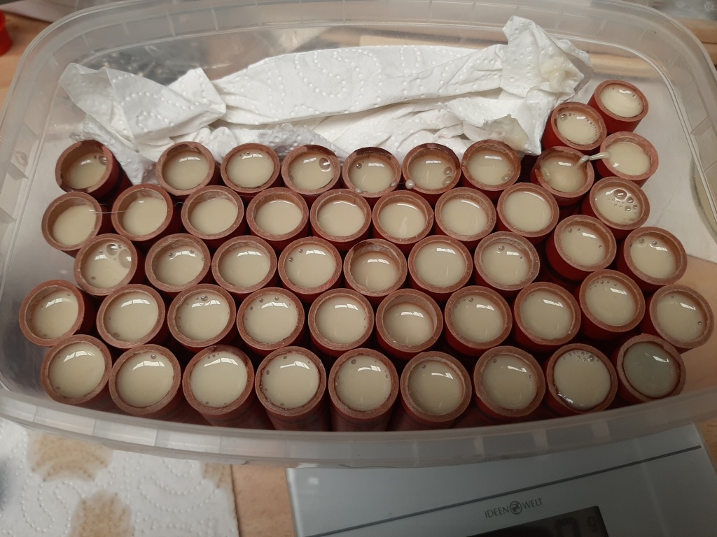 am Heck werden sie wieder zuverlässig mit diesem Resin Gießharz verschlossen, das hat den Zweck, wenn einer der Motoren ungeplant durchzünden sollte, wird keiner seiner "Nachbarn" von hinten gezündet...