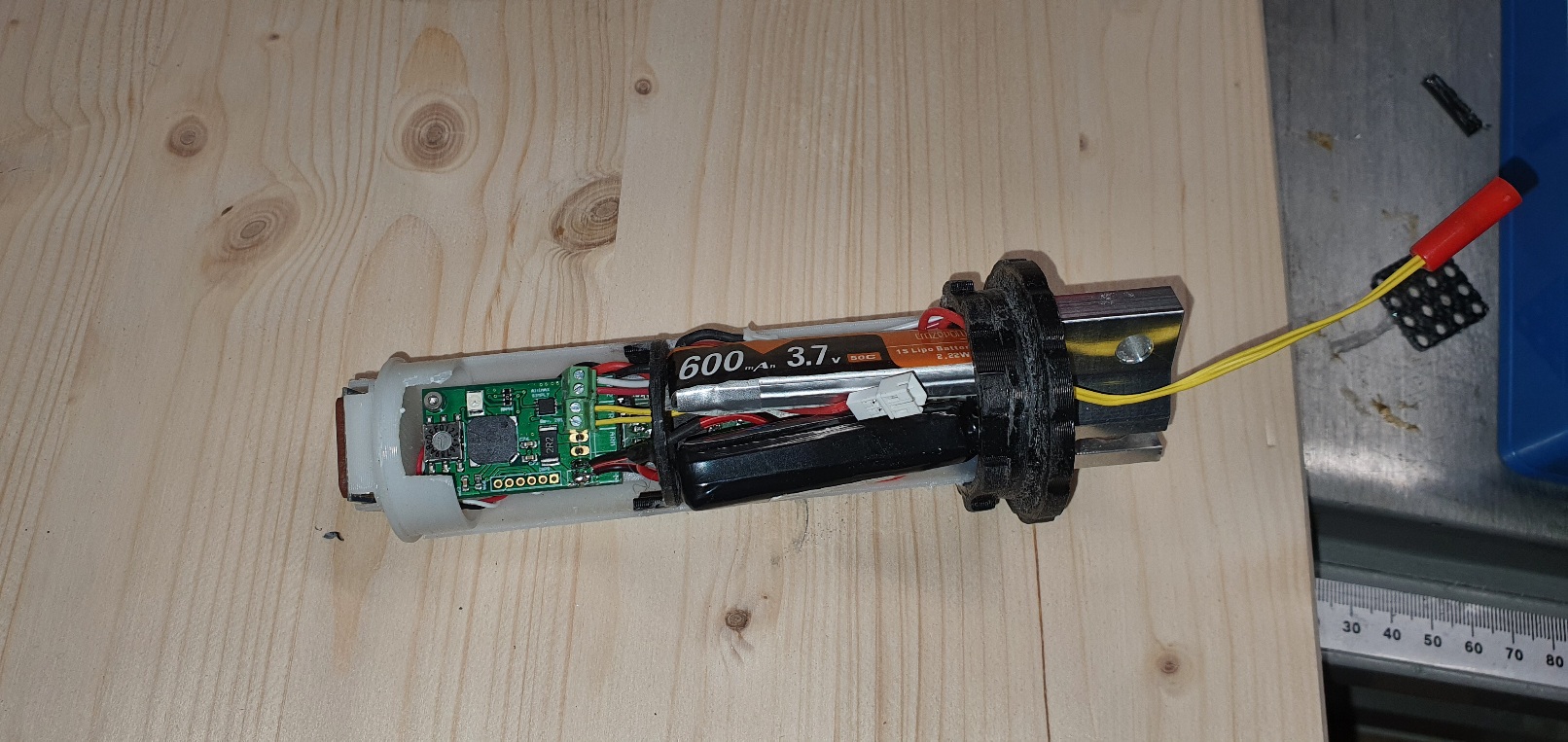 Unten habe ich ein Lora Tracker verbaut. Darüber einen Simpli. Beide haben einen eigenen Akku. Der Plan ist, den Tracker direkt mit dem Akku zu verbinden und ihn schon vor dem Flug zu aktivieren. Der Simpli wird mit einem Schraubenschalter aktiviert. Dazu ist die Bohrung neben dem Relais. Aus Platzgründen muss man die Sn0 Innen auf der Platine anklemmen. Das Pyrorelais ist bei der Goblin etwas überamitioniert, da ich vermutlich keinen Platz für den Fallschirmbehälter haben werde. Schauen wir mal, was mir dazu noch einfällt.